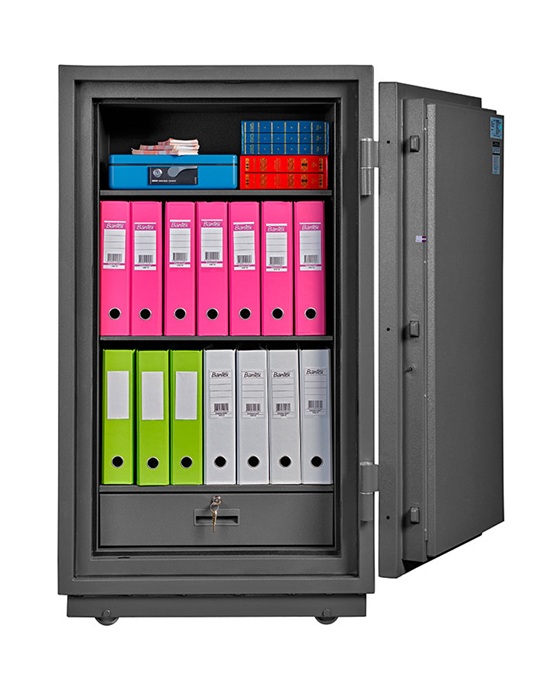 Сейфы серии FRS предназначены для сохранности документов и ценностей при пожаре Сертификат на огнестойкость – ГОСТ Р 57384-2017, класс 60Б При заливке двери и корпуса сейфа используется запатентованный состав огнестойкого бетона В конструкции применен тепловой замок, обеспечивающий огнестойкость в области притвора дверцы сейфа и препятствующий прохождению теплового потока Также периметр дверного проема оборудован огнестойким уплотнителем Сейф имеет ригельную система запирания В комплект поставки входят полка, кассовое отделение, пластиковые ножки и анкерное крепление к полу Установлен кодовый механиеский и ключевой замок Внимание - испытание на огнестойкость проведено с анкерным отверстием!